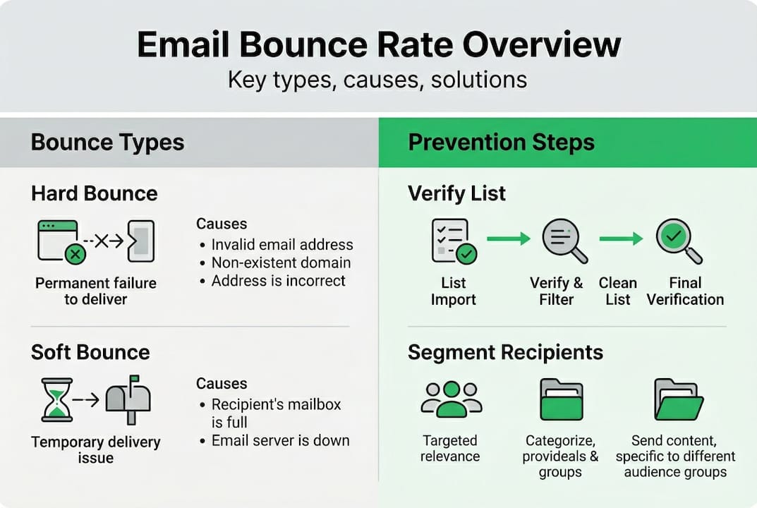 Implement email verification and double opt-in to reduce bounces and improve deliverability.
