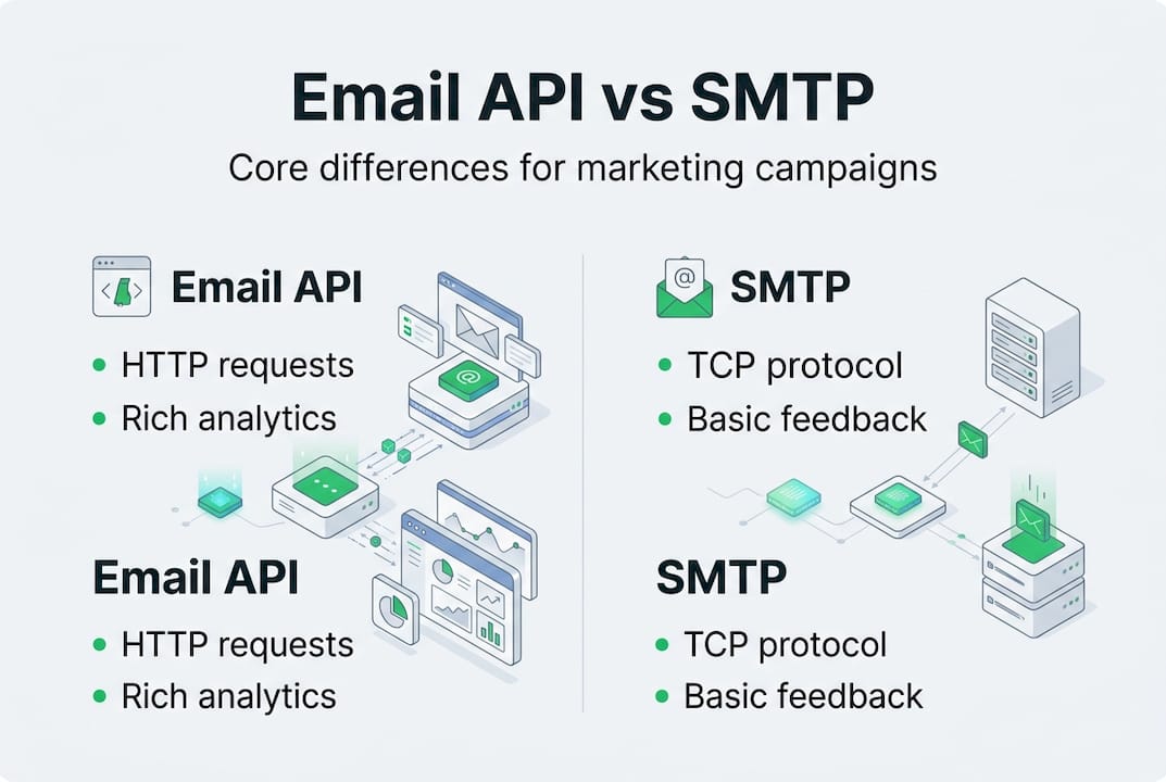 Pro Tip: For large volume campaigns, prioritize email APIs for deliverability and insights. Reserve SMTP for legacy systems or simple transactional needs where advanced tracking is unnecessary.