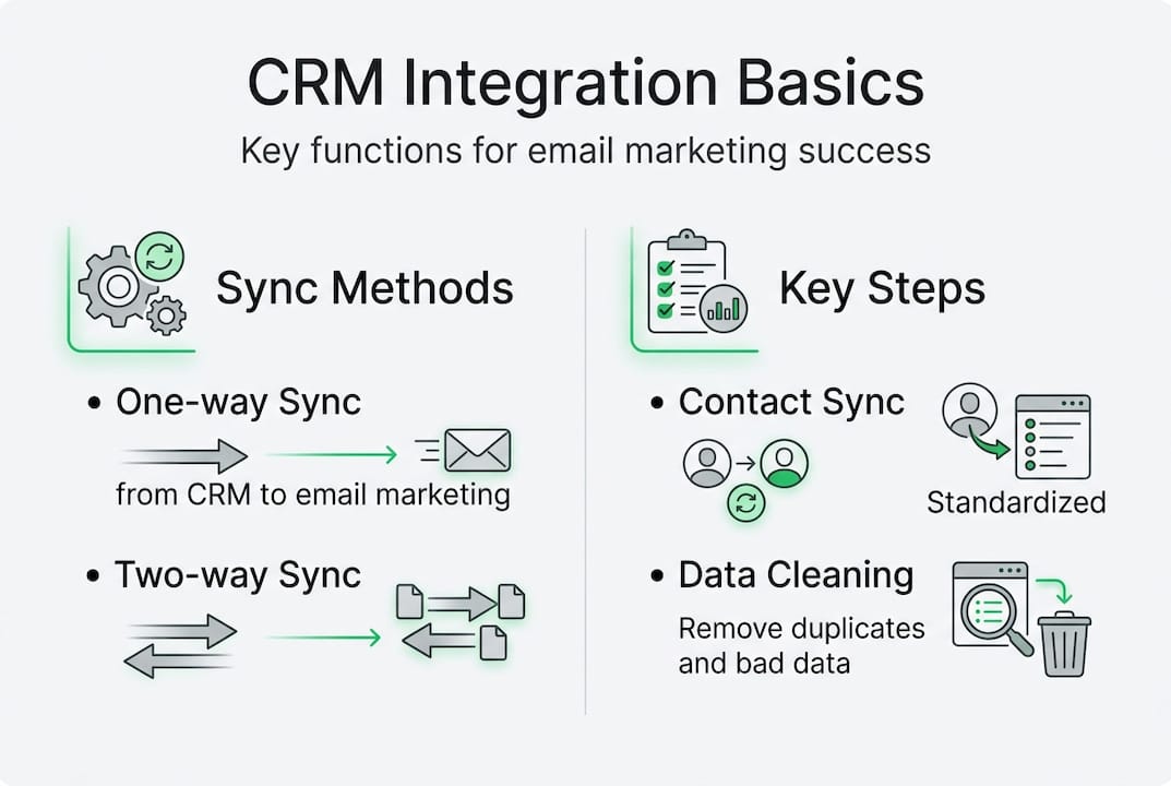 Pada intinya, integrasi yang dibangun dengan baik menangani tiga fungsi kritis. Pertama, sinkronisasi kontak memastikan bahwa pelanggan baru, profil yang diperbarui, dan unsubscribe tercermin di kedua sistem tanpa intervensi manual. Kedua, pengayaan data menarik atribut CRM seperti tahap penawaran, tingkat akun, atau penggunaan produk ke dalam platform email Anda sehingga segmen menjadi lebih tepat. Ketiga, pemicu perilaku memicu urutan otomatis berdasarkan tindakan yang tercatat dalam CRM, seperti kedaluwarsa uji coba, penutupan tiket dukungan, atau pembelian yang selesai.