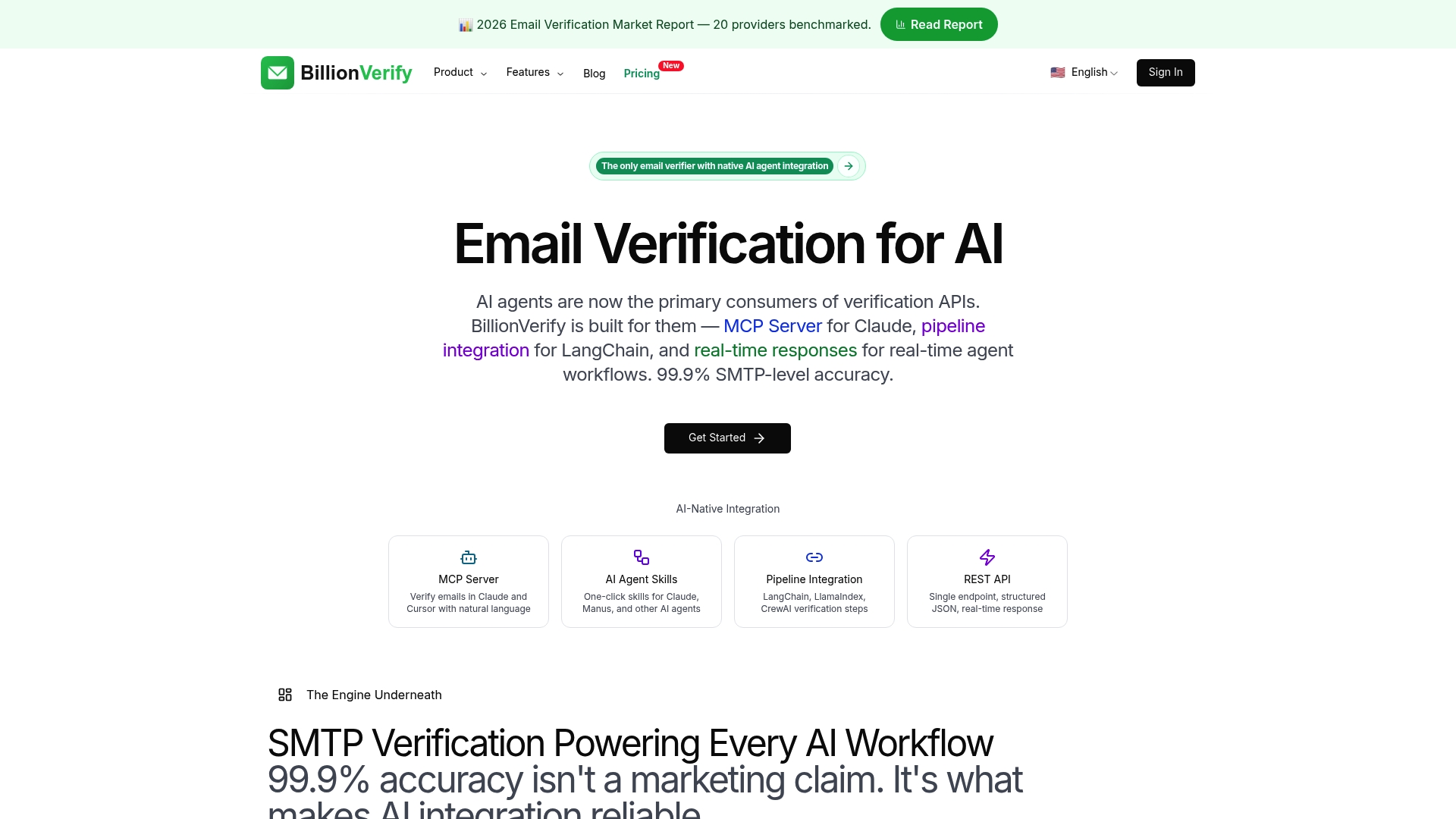 BillionVerify wyróżnia się połączeniem API przyjaznych automatyzacji ze stosem weryfikacji dostrojoną do dokładności i skali. Jego wielowarstwowe kontrole i weryfikacja skrzynek SMTP generują działalne wyniki zarówno dla przepływów pracy w czasie rzeczywistym, jak i zbiorczego czyszczenia. Zespoły, które priorytetyzują dostępność i chcą usługi weryfikacji integrującej się z agentami AI, wybierają BillionVerify, ponieważ zmniejsza to wskaźniki odbicia, dopasowując się do istniejącej automatyzacji bez intensywnej interwencji ręcznej.